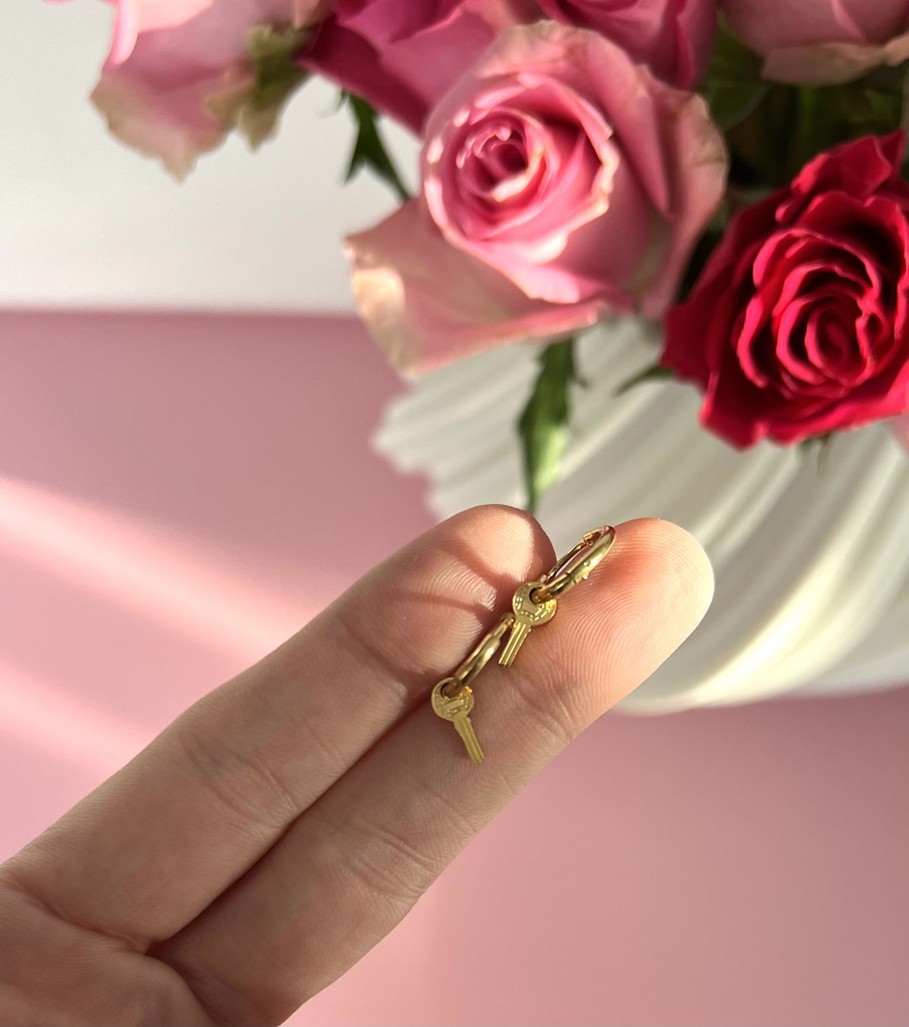 Filigrane und sehr kleine Schlüssel Ohrringe – dezent, aber voller Bedeutung. Der Schlüssel steht für Freiheit, Neuanfang oder vielleicht ist es der Schlüssel zu einem Herzen?
