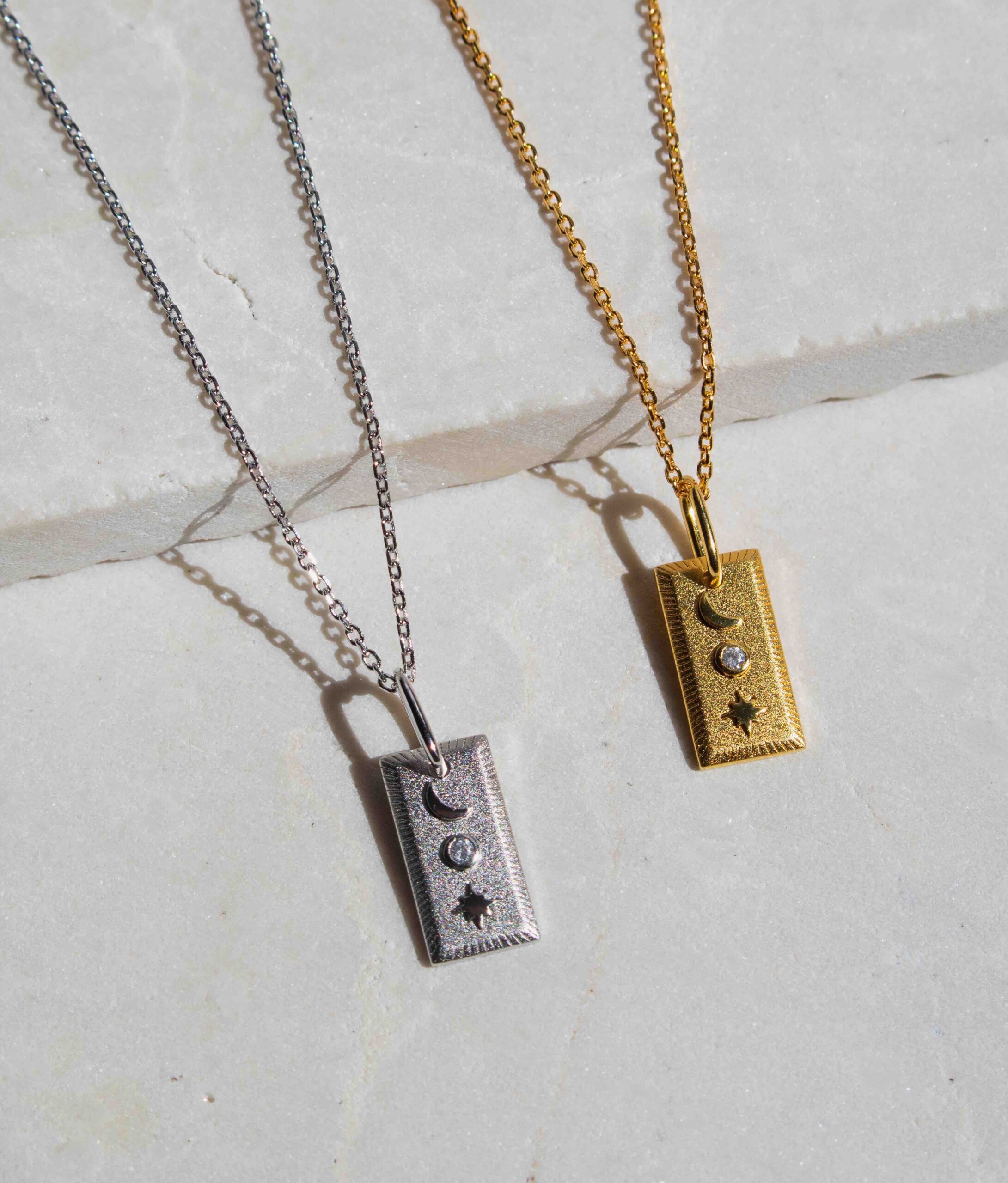 Let’s Sparkle! Die Moon Child Halskette schimmert verführerisch. Der rechteckige Anhänger, welcher mit einem zarten Zirkonia Stein verziert ist, bildet hierbei das absolute Herzstück und wird von einem Mond und Stern umringt.