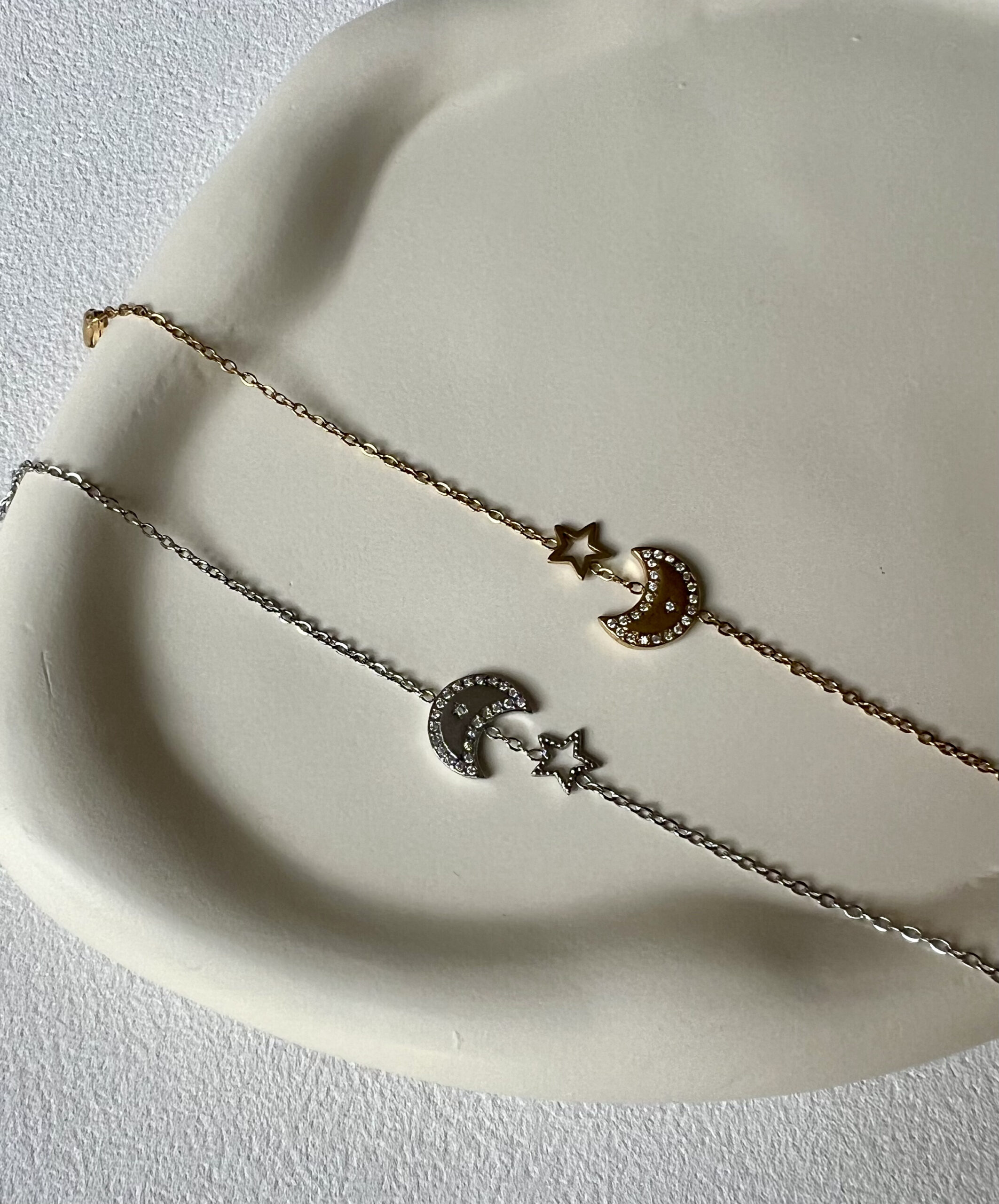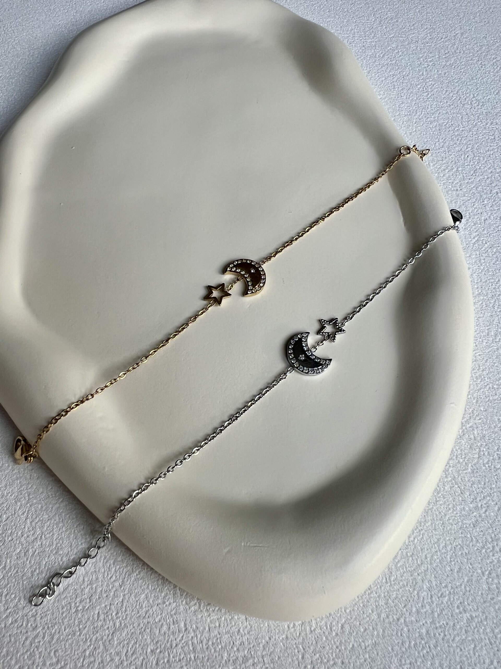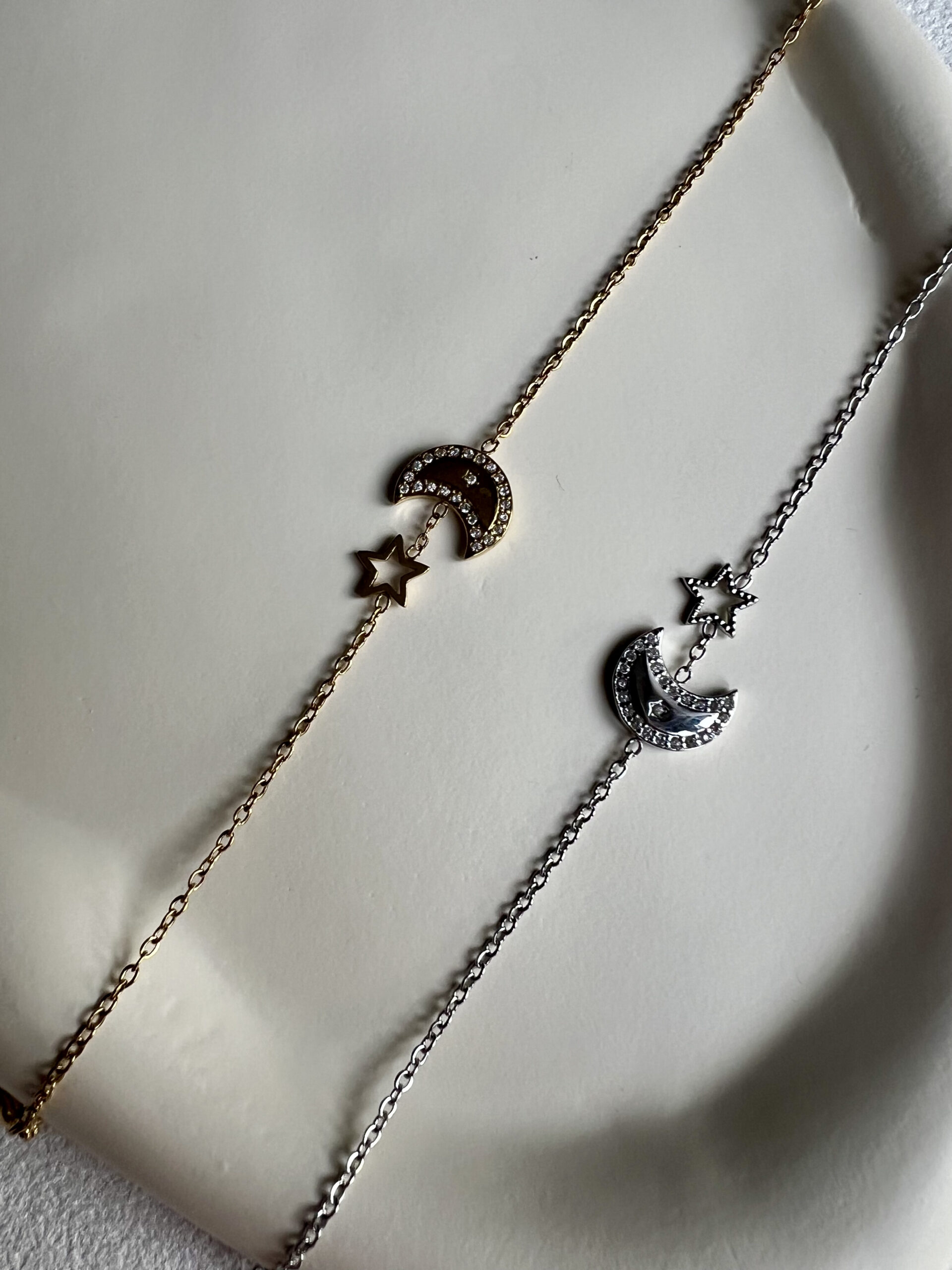 Dieses Zarte Armband verzaubert mit einem funkelnden Mond und Stern. In Gold und Silber erhältlich.