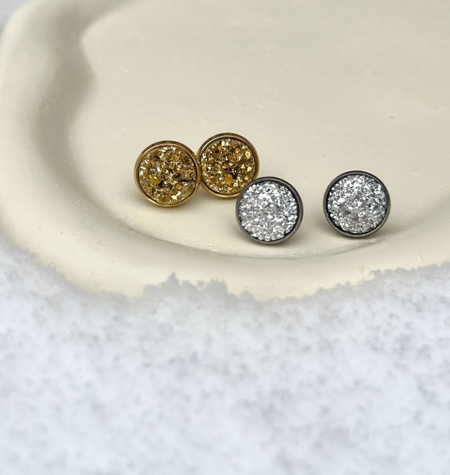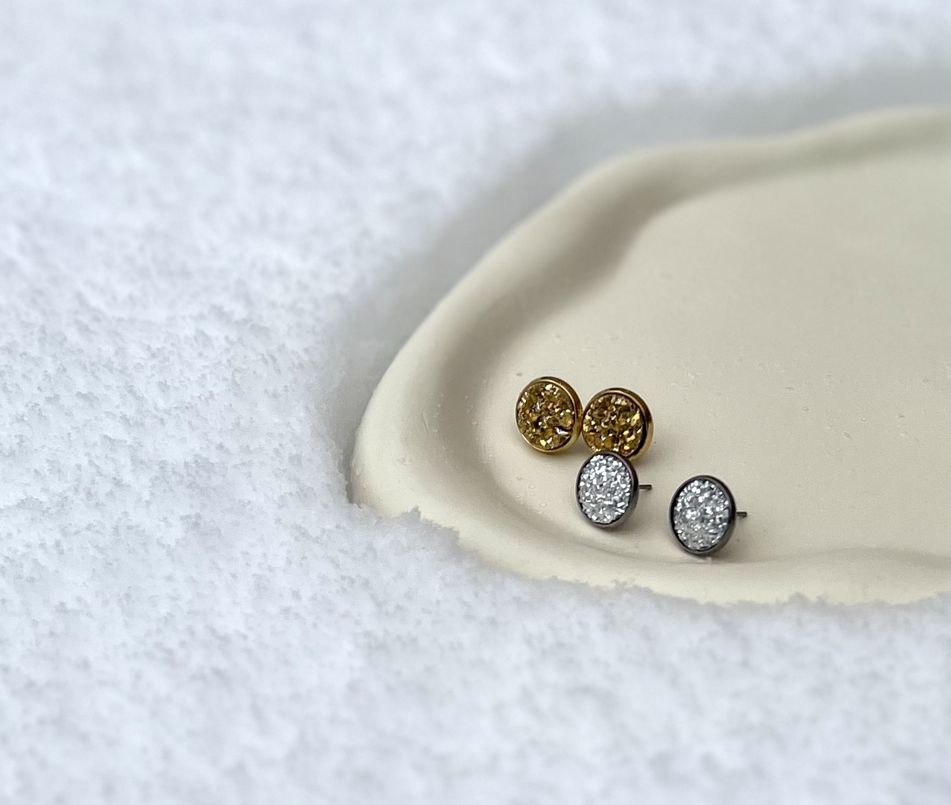 Wie frostiges Licht am Winterhimmel schimmern unsere Schneefunkeln Ohrstecker aus Resin in edlen Gold- oder Silbernuancen. Jeder Ohrring fängt das Licht auf seine ganz eigene Weise ein und erinnert an klare Winternächte voller Ruhe und leiser Magie.